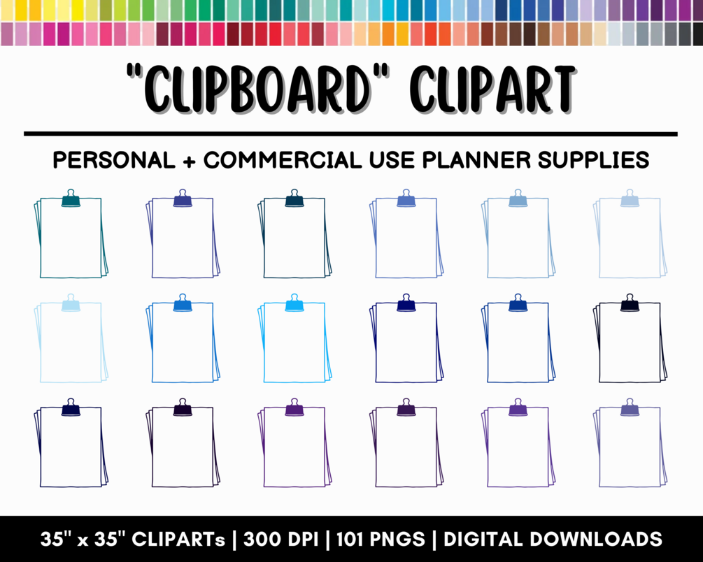 Planner Clipboard clipart is a set of 101 clipart images in bright, pastel, dark and neutral colors. All colors shown in the second preview are included!. Each image comes in a separate PNG file with transparent background and measures 37.5 x 37.5 inches ( 3600px X 3600px ) inches at the widest point. These clipart images are perfect to create planner stickers sheets for Erin Condren, Mambi Happy Planner, Plum Paper, Limelife, etc., and you can also use them in any digital planner like GoodNotes or other non-planner related projects like scrapbooking, journaling, craft projects, card and invitation designs, party printables, wall prints, decals, transfers and more!.