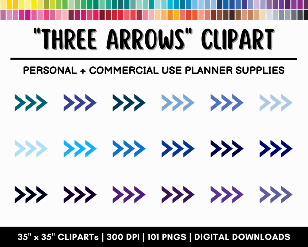 Three Arrows Right clipart is a set of 101 clipart images in bright, pastel, dark and neutral colors. All colors shown in the second preview are included!. Each image comes in a separate PNG file with transparent background and measures 37.5 x 37.5 inches ( 3600px X 3600px ) inches at the widest point. These clipart images are perfect to create planner stickers sheets for Erin Condren, Mambi Happy Planner, Plum Paper, Limelife, etc., and you can also use them in any digital planner like GoodNotes or other non-planner related projects like scrapbooking, journaling, craft projects, card and invitation designs, party printables, wall prints, decals, transfers and more!.