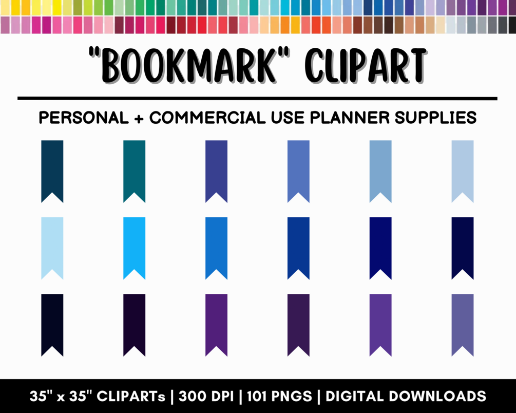 Planner Bookmark clipart is a set of 101 clipart images in bright, pastel, dark and neutral colors. All colors shown in the second preview are included!. Each image comes in a separate PNG file with transparent background and measures 37.5 x 37.5 inches ( 3600px X 3600px ) inches at the widest point. These clipart images are perfect to create planner stickers sheets for Erin Condren, Mambi Happy Planner, Plum Paper, Limelife, etc., and you can also use them in any digital planner like GoodNotes or other non-planner related projects like scrapbooking, journaling, craft projects, card and invitation designs, party printables, wall prints, decals, transfers and more!.