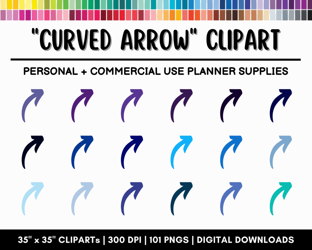 Arrow Smooth Curved clipart is a set of 101 clipart images in bright, pastel, dark and neutral colors. All colors shown in the second preview are included!. Each image comes in a separate PNG file with transparent background and measures 37.5 x 37.5 inches ( 3600px X 3600px ) inches at the widest point. These clipart images are perfect to create planner stickers sheets for Erin Condren, Mambi Happy Planner, Plum Paper, Limelife, etc., and you can also use them in any digital planner like GoodNotes or other non-planner related projects like scrapbooking, journaling, craft projects, card and invitation designs, party printables, wall prints, decals, transfers and more!.